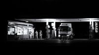 Deze zwart-witfoto toont een nachtelijke scène bij een verlicht tankstation, wat een sfeer van stilte en mysterie creëert. De foto is genomen vanuit de duisternis, waardoor het tankstation als een helder verlicht eiland in de nacht verschijnt.