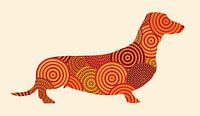 Een teckel silhouet in de stijl van Aboriginal kunst, gevuld met warme tinten, tegen een crèmekleurige achtergrond. Het patroon bevat ingewikkeld en gedetailleerd cirkelvormige ontwerpen van verschillende groottes en kleuren, waardoor een dynamisch contrast ontstaat dat de vorm van de teckel benadrukt.