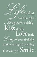 Dit inspirerende typografische kunstwerk met de tekst "Life is short, break the rules" heeft een groene achtergrond en heldere witte letters, wat zorgt voor een levendige en energieke uitstraling. De groene tint straalt rust en vitaliteit uit, terwijl de witte letters de krachtige boodschap op een stijlvolle manier benadrukken. Het…
