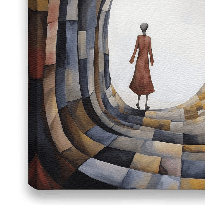 Conceptuele abstracte kunst met kubistische elementen in warme aardetinten en pastelkleuren met een vrouw die door een tunnel naar het licht loopt.