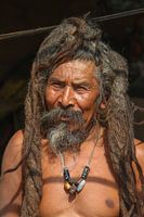Deze Sadhoe staat op de drempel van zijn onderkomen dat bestaat uit een ruimte van zo’n 3,5 m2 en ligt een verzameling van wat oude dekens, afval, vodden en wat ‘eten’.