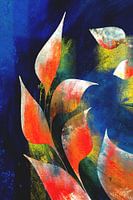Bloemig abstract in rijke en diepe veelkleurige kleuren (accent op rood-oranje en blauw)