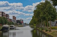 Het kanaal is een druk vaargebied waar diverse boten en schepen doorheen varen. In de verte zie je nog een silo waar oa graan in een schip geladen werd.