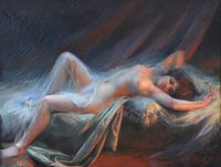 De schilder Delphin Enjolras schilderde erg realistisch, vaak met doorzichtige stoffen. Vaak naakt waarbij een vrouw model staat. Ook hier ligt een meid verleidelijk en sensueel bloot te poseren op de lakens. Het naaktmodel haar benen, dijen, heupen, buik en borsten zijn geportretteerd.
