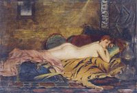 Dit naaktmodel ligt op haar buik op een tijgervel. De meid lig bloot, maar heeft haar onderbenen bedekt, maar billen, rug en schouders ontbloot. De vrouw ligt op een kussen en kijkt dromerig naar de artiest met haar lippen sensueel van elkaar.