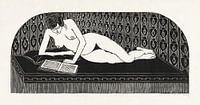 Een vrouw ligt een blad te lezen. Het model ligt als naaktmodel, waardoor benen, heupen, schaamstreek, bui, torso en borsten bloot op het portret staan.
