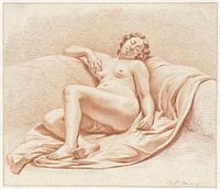 Vrouw ligt als naaktmodel op dit portret, dus een naaktportret. Van de meid zijn de benen, buik, borst, borsten en schouders bloot op het kunstwerk gezet, een tekening of illustratie. Ze heeft met haar hand een tiet vast.