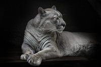 Koop de foto Liggend wendt vermoeid zijn hoofd af liggende poema, zwarte achtergrond van Michael Semenov op canvas, aluminium dibond, (ingelijste) fotoprint, behang en ArtFrame, op maat geprint in Fine-Art kwaliteit.