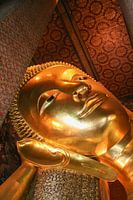 Weerspiegeling van licht op het gigantische goudkleurige beeld van de liggende Boeda in de Wat Pho tempel in Bangkok, Thailand