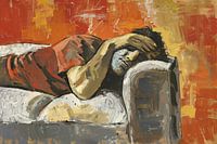 Dit kunstwerk toont een persoon in een ontspannen positie op een bank, omgeven door levendige en warme kleuren die een gevoel van comfort en introspectie oproepen. Het abstracte gebruik van penseelstreken en kleurvlakken maakt dit werk een moderne expressie van rust en bezinning. Ideaal voor ruimtes die een rustgevende sfeer nodig…