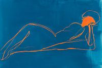 Een gestileerde figuur in een ontspannen houding ontvouwt zich in een harmonieus samenspel van diepblauw en helder oranje. De gebogen lijnen belichamen elegantie en sereniteit en geven elke kamer een ontspannen sfeer. Dit kunstwerk is ideaal voor de slaapkamer en nodigt uit om te dromen en te verwijlen.