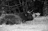 Liggende schotse hooglander in zwart wit van Gerard de Zwaan