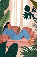 Het kunstwerk toont een jonge vrouw die ontspannen leest op een roze bank, omringd door grote tropische planten en palmbladeren. De serene, kalme sfeer en de heldere kleuren stralen een gevoel van rust en vrede uit, alsof we een momentopname zien van een vredige, natuurlijke omgeving.