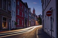 De koplampen van voorbij rijdende aut'os trekken lichtsporen in deze avondfoto van de Maastrichtse binnenstad.