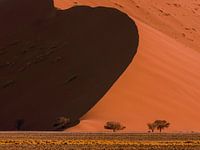 Tijdens zonsondergang valt het licht van de zon op 1 kant van het zandduin. De andere kant wordt verhuld in de schaduw. Dit geeft een mooi contrast tussen het warme rode zand en de koele schaduwzijde. De bomen en de oryx voegen een extra gelaagdheid toe aan de foto.