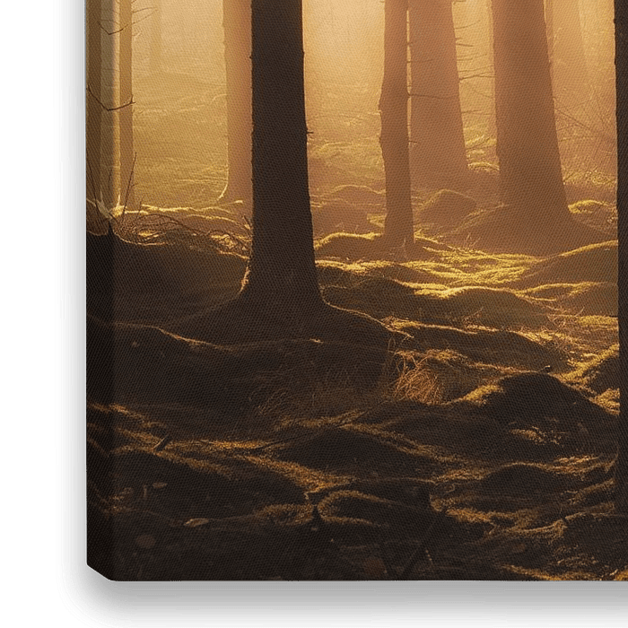 In een donker bos in de buurt van Gasselte in Drenthe branden de eerste zonnestralen van de dag de mist weg op een mooie herfstochtend in oktober. Een mystieke en sfeervolle ochtend.
