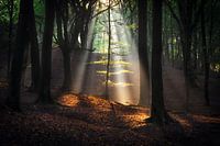 Een paar zonnestralelen verlichten een boompje wat verscholen staat tussen de grotere oudere bomen.