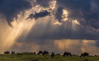 An early morning at Maasai Mara, Kenya! Beautiful light rays coming through the dark clouds illuminating the grazing Wildebeest!
