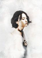 Portret van een Aziatische vrouw in een witte jurk, mixed media schilderij in wit en zacht beige tinten