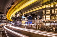 Lijn 5 passeert Koningsplein in Amsterdam. Door de lange belichtingstijd blijven alleen de lichtsporen zichtbaar.
