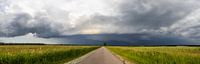 Links en rechts van de weg kleurden de weilanden frisgroen – nat en zwaar onder een geladen lucht. Het panorama benadrukte de weidsheid van het landschap en de beweging van de luchtmassa's. Je voelt dat er iets aankomt, maar het moment is nog stil.