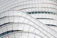 Je ziet de lijnen van een deel van een gebouw. Doordat je niet het hele gebouw ziet prikkel je de fantasie van de kijker om te bedenken waar deze lijnen naartoe gaan en hoe dit gebouw eruit ziet.