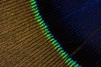 "Lijnen van het oog van een pauwenveer" is een extreme macrofoto van een heel klein stukje van een pauwenveer. Door de veer op de juiste manier te belichten, komen de mooie glanzende kleuren naar voren.