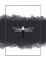 Moderne kunst met een lijntekening van een libel. Donkere achtergrond en een rand van goud.