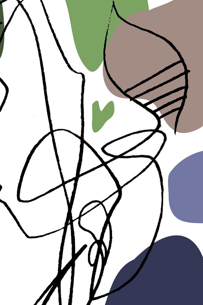 Eigentijds kunstwerk van de zijkant van het gezicht van een meisje. Dit artistiek werk bestaat uit zwarte lijnen, gecombineerd met een vijftal zorgvuldig afgestemde kleuren