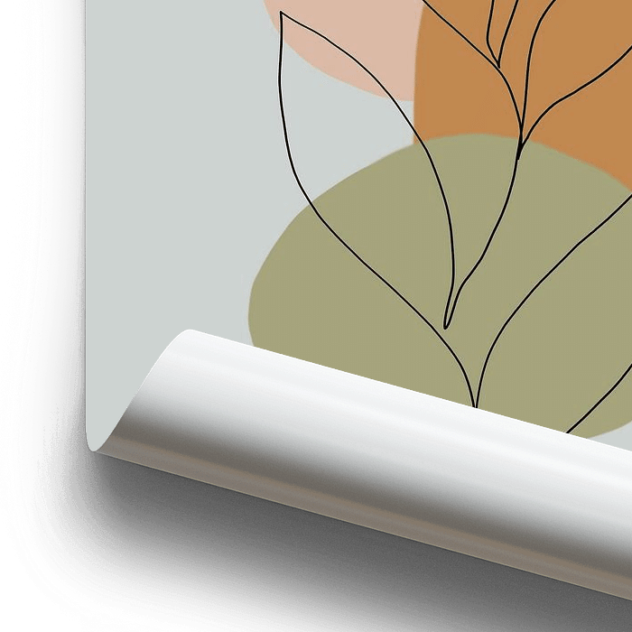 Een tak met bladeren omringt door organische vormen in trendy kleuren. Passend bij de trend van dit moment : Groovy champagne.