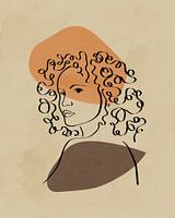 Minimalistische lijntekening van een vrouwengezicht met krullend haar, en twee organische vormen op de achtergrond. De kleuren - beige, bruin en oranje - zijn aardetinten, geïnspireerd door de ondergaande zon in de herfst.