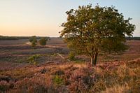 Een solitaire lijsterbes boom op de bloeiende heide van de Renderklippen op de Veluwe bij het laatste strijklicht van de ondergaande zon.