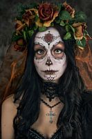 Portret van mooie jonge vrouw met zogenaamd Sugar Skull make up en een krans van rozen op het hoofd.