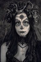 Duo tone versie - Mooie Jonge vrouw met zogenaamd Sugar Skull make up met een krans van rozen op haar hoofd.