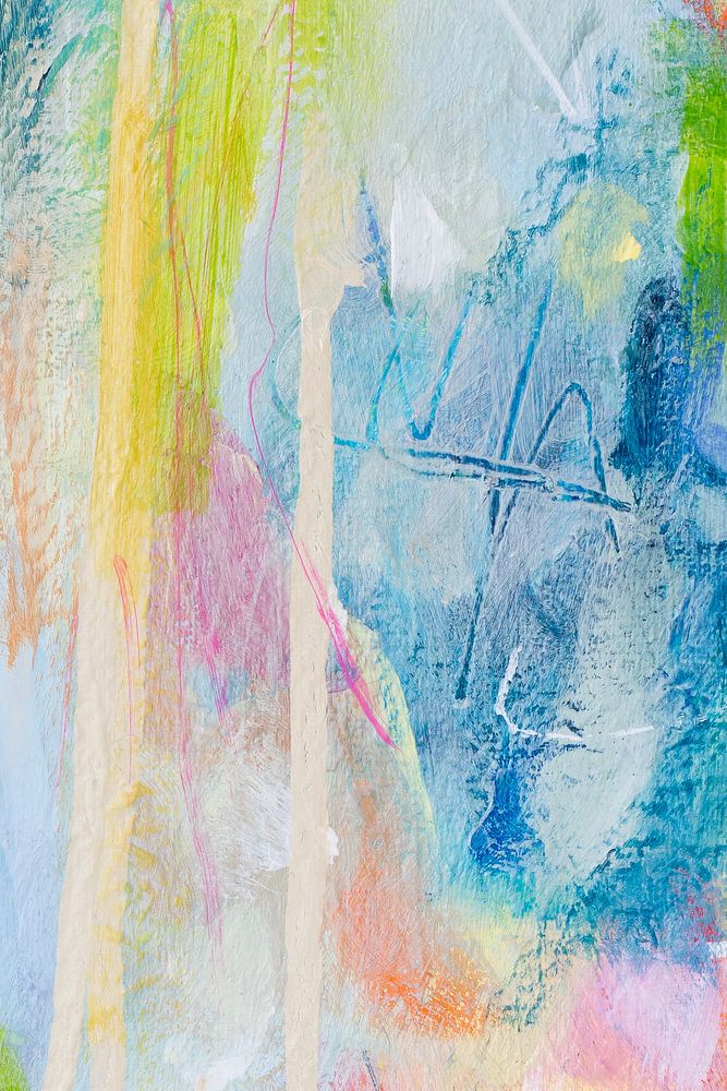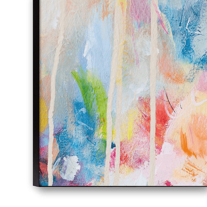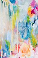 Een bontgekleurd abstract schilderij, vol met smeuïge zichtbare penseelstreken. De rijke tinten geven dit werk een zacht zomerse of lentefrisse uitstraling. In een neutraal interieur kan een schilderij als dit echt voor een transformatie zorgen van de sfeer, vooral als groot 'statement piece' op een royale wand.