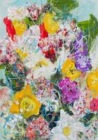 Bij dit schilderij heb ik me weer lekker laten gaan met markeringen. Met oliepastelkrijt, potlood en verfmarkers is het impressionistische boeket verder tot leven gewekt. Een kleurrijk beeld van zonnige, vrolijke bloemen die energie uitstralen.