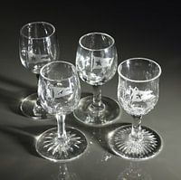 Vier verschillende likeurglaasjes in kristalglas met het logo van de White Star Line. Deze glaasjes werden aan boord van verschillende schepen van de White Star Line gebruikt waaronder ook de Titanic.