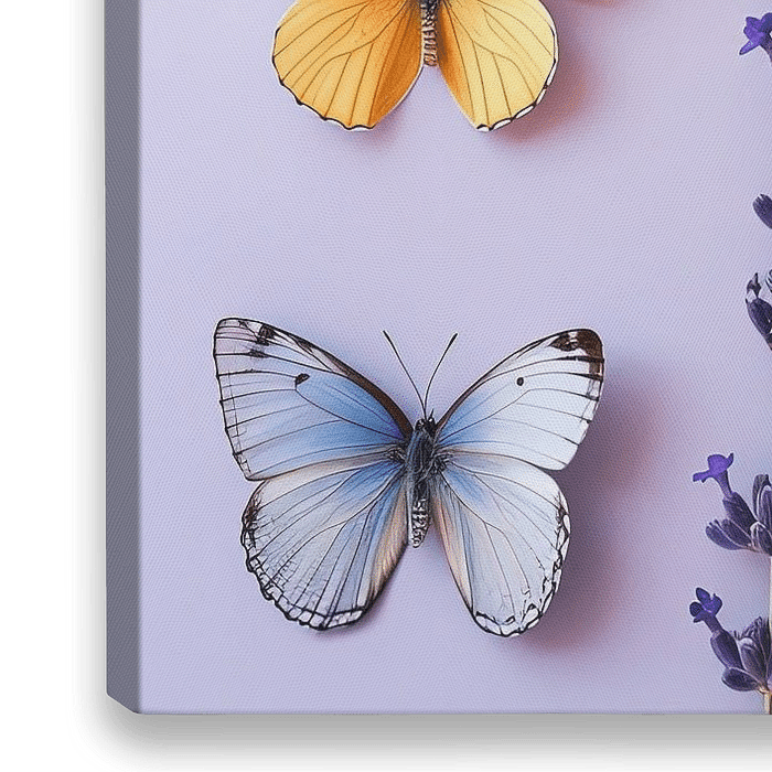 Dit lieflijke, trendy kunstwerk biedt een harmonieuze combinatie van natuurlijke schoonheid en artistieke ordening, waarbij verschillende soorten vlinders naast stengels van lavendel zijn geplaatst op een zacht paarse achtergrond.