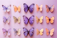 Dit lieflijke, trendy kunstwerk presenteert een fascinerende verzameling vlinders, tentoongesteld tegen een uniforme lavendelkleurige achtergrond.