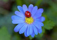 Fotografie Ina Holzel. Lieveheersbeestje op een licht paarse bloem, leuk kleureffect. Een plantje