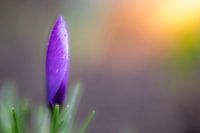 Een prachtige zachte romantische macrofoto van een lila krokus tijdens een sfeervolle zonsopkomst. Een fraaie macrofoto met beperkte scherptediepte (DOF). De minimale DOF geeft het werk de fraaie zachte en romantische sfeer en veranderd de achtergrond in een mooi zacht en kleurrijk bokeh. Het mooie zachte goudenlicht van de opkomende…