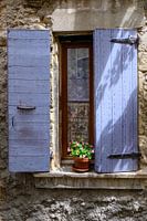 De straatjes rondom de donjon(toren) in Crest lopen rond en kronkelig. De romantiek druipt ervan af! Dit werk toont de lila raamluiken van één van de huisjes.