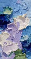 Dynamisch spel van verfstreken waarin koele tinten de hoofdrol spelen. Dikke lagen blauw, lila, wit en vleugjes groen zijn met krachtige bewegingen opgebracht, waardoor het oppervlak een voelbare textuur krijgt. De penseelstreken variëren in richting en intensiteit: sommige zijn breed en vloeiend, terwijl andere juist kort en gelaagd…