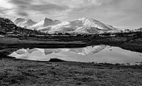 Zwart-witbeeld van de reflectie van besneeuwde bergen in een meertje op de Lofoten, Noord-Noorwegen.