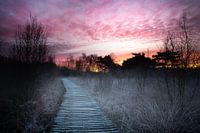Dageraad in de Groote Peel op de grens tussen Limburg en Noord-Brabant. Wandelpad vlak voor zonsopkomst.