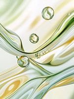 Abstracte kunst met waterdruppels en vloeiende vormen in frisse limegroen en okergeel tinten.