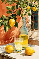 Een sfeervolle aquarel die een tijdloos mediterraan moment vangt: sappige citroenen hangen aan een weelderige tak tegen een terracotta muur, terwijl op een stenen richel een fles en glas met goudgele drank staat te schitteren in het warme zonlicht. De compositie ademt de essence van een zorgeloze Italiaanse zomerdag.