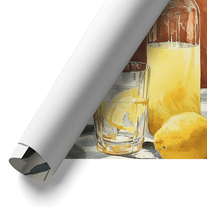 Een aquarel illustratie van een zomers stilleven met rijpe citroenen aan een tak en op tafel, vergezeld door een transparante fles met gele limonade en een leeg glas. De warme terracotta achtergrond en het spel van licht en schaduw creëren een mediterrane sfeer die doet denken aan een zonnige Italiaanse middag.