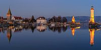 Panorama van de haven van Lindau aan het Bodenmeer na zonsondergang.