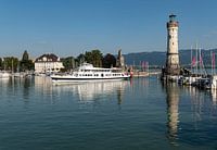 Lindau Bavaria Germany 19th September 2024The harbour entrance with its iconic lion and lighthouse are reflected in the waters of the harbour.A passenger ship Zürich enters the harbour. blue, skies, leuchturm, bayern, lake constance, bodensee,